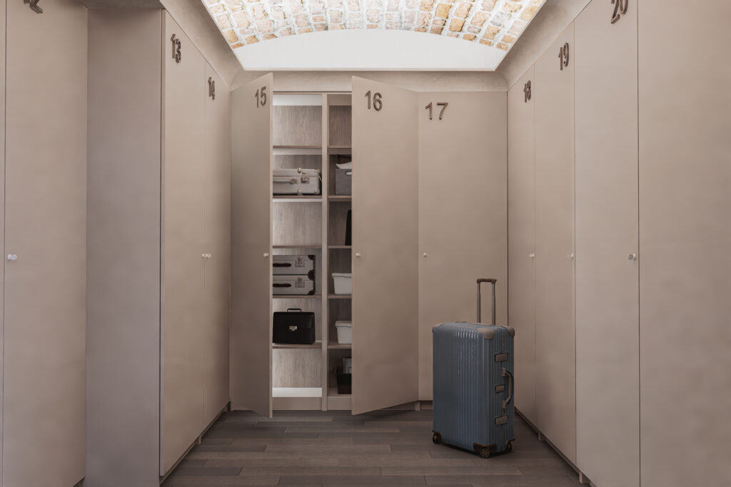 Dimentica le cantine umide e disordinate. Il tuo “Bagagli Box” è un vero armadio privato, pulito e strutturato con ripiani, per archiviare valigie, attrezzature da golf o da sci con il massimo ordine.